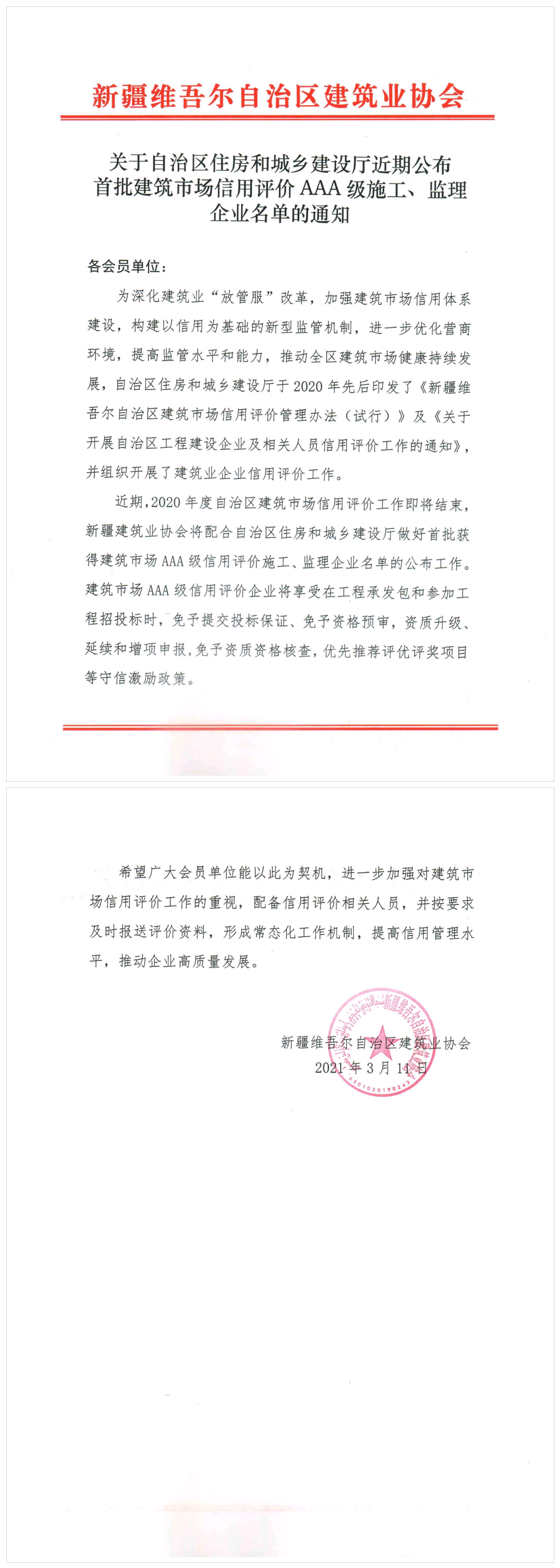 关于自治区住房和城乡建设厅近期公布首批建筑市场信用评价AAA级施工、监理企业名单的通知