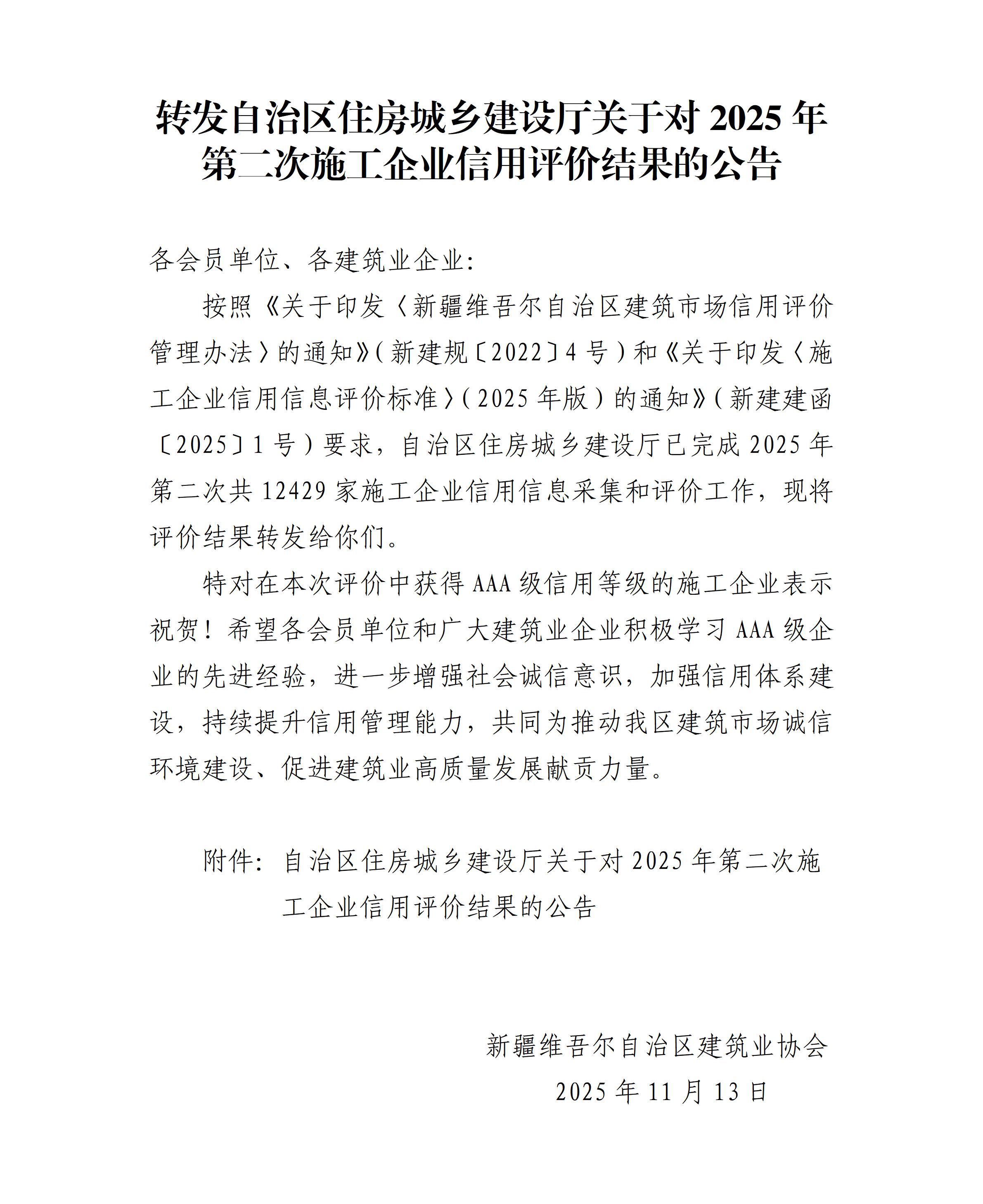 转发自治区住房城乡建设厅关于对2025年第二次施工企业信用评价结果的公告