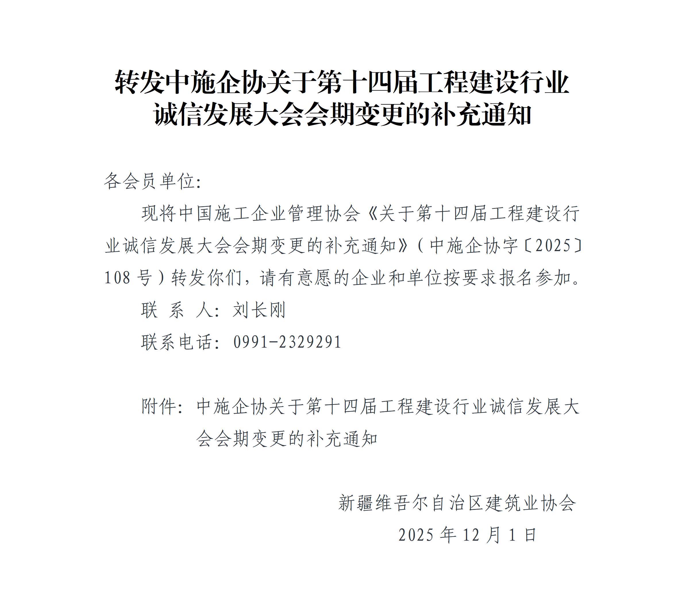 转发中施企协关于第十四届工程建设行业诚信发展大会会期变更的补充通知