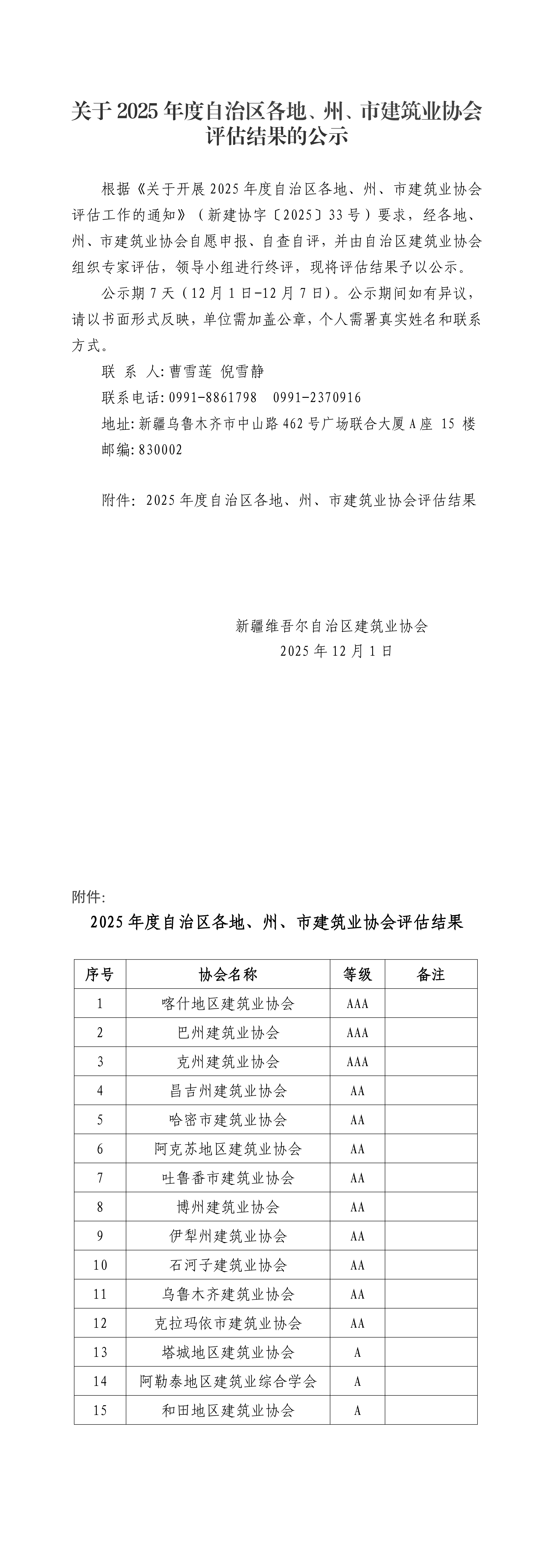 关于2025年度自治区各地、州、市建筑业协会评估结果的公示