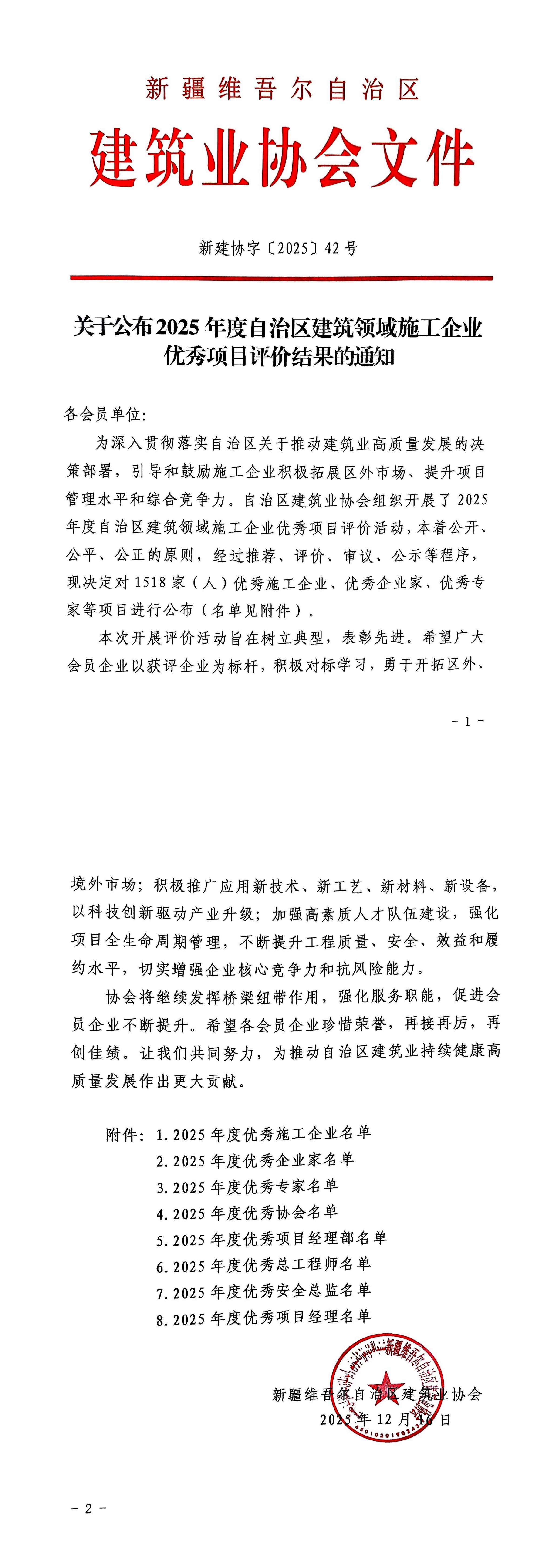 关于公布2025年度自治区建筑领域施工企业优秀项目评价结果的通知